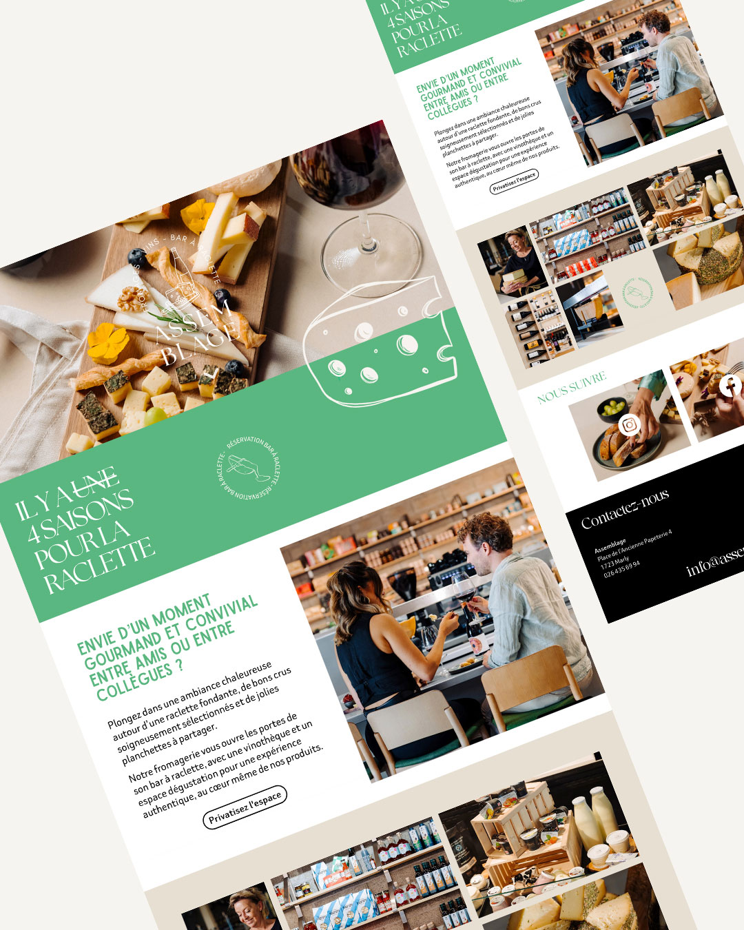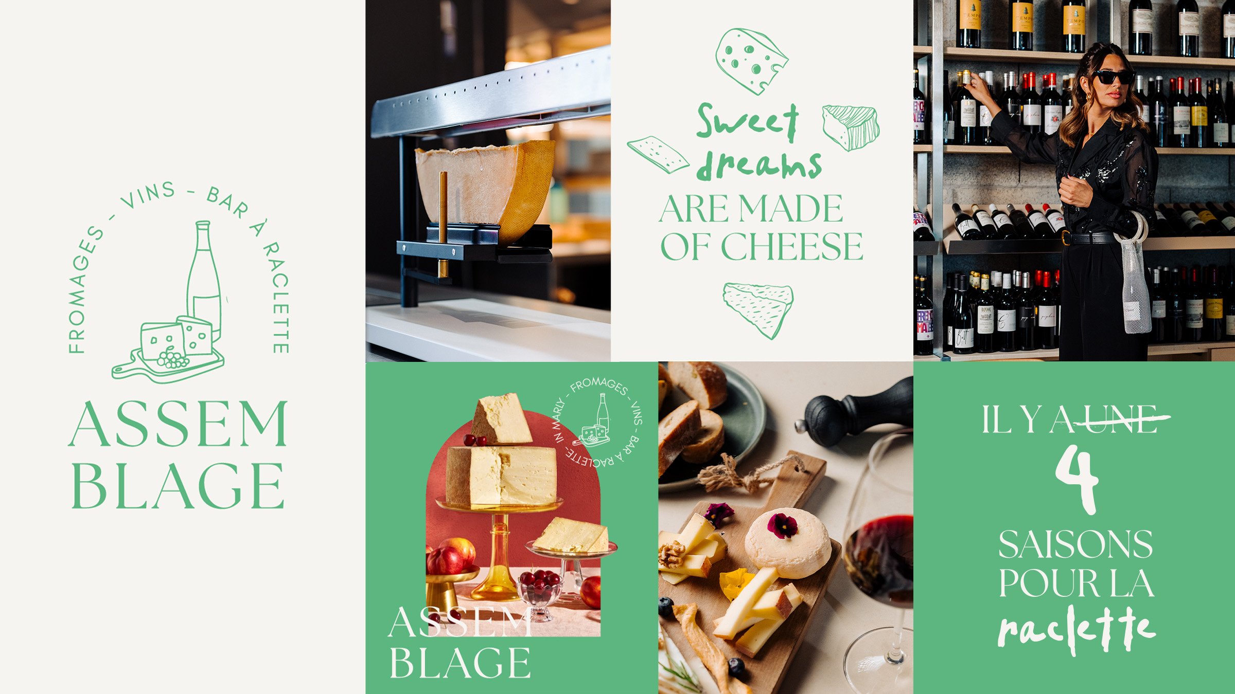 J’ai imaginé une identité visuelle qui s’éloigne volontairement des codes classiques du secteur. Plutôt que le jaune traditionnel du fromage, le choix s’est porté sur un vert profond, évoquant les prairies suisses et la naturalité des produits. Ce parti pris permet d’ancrer la marque dans son origine tout en affirmant une personnalité forte. L’univers graphique s’appuie également sur des illustrations réalisées à la main et sur des jeux de mots autour de la gastronomie, afin de renforcer la dimension conviviale et authentique du lieu. L’ensemble crée une identité chaleureuse et distinctive, à l’image d’Assemblage : un endroit où les produits, les savoir-faire et les plaisirs de la table se rencontrent.