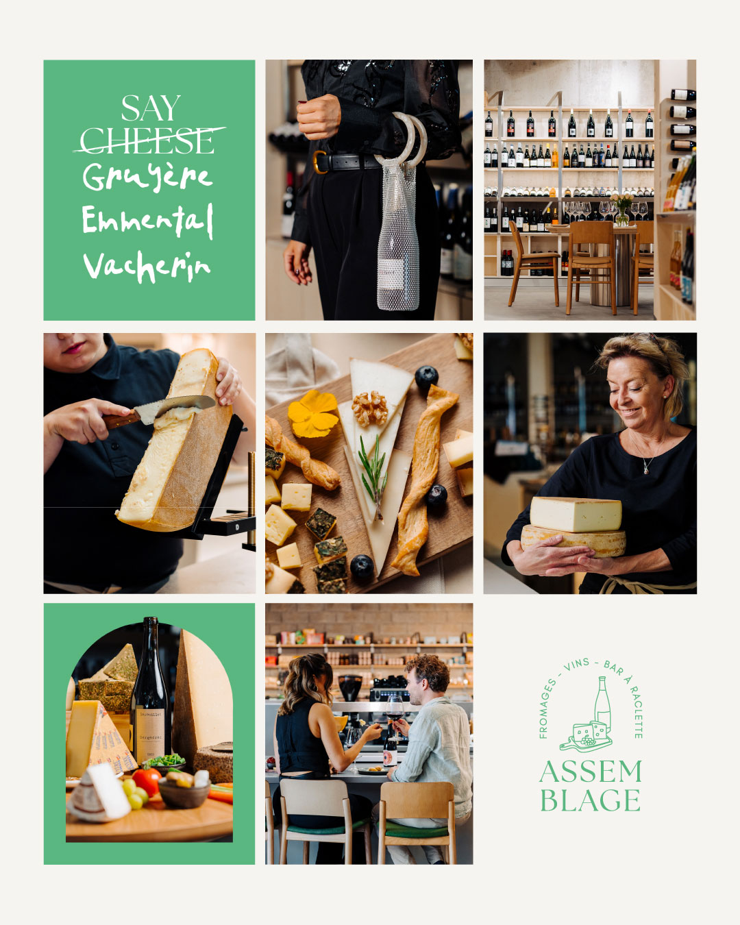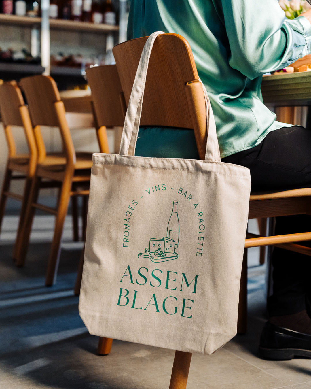 Pour Assemblage, l’enjeu était de créer une identité de marque capable de réunir plusieurs univers gourmands au sein d’un même lieu : fromagerie, bar à raclette, cave à vin et épicerie fine. Ce type de concept peut rapidement tomber dans des codes très attendus, couleurs jaunes associées au fromage, univers rustique ou très traditionnel. Le défi consistait donc à construire un branding qui évoque l’authenticité et les produits de terroir, tout en apportant une touche de modernité et de singularité. L’objectif : séduire à la fois les épicuriens exigeants et les curieux du goût, en créant une identité qui reflète la convivialité et la richesse de l’expérience proposée.